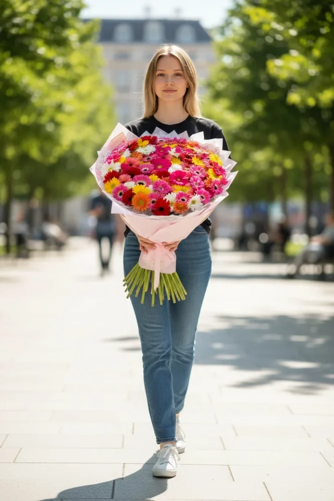 Este ramo es un arreglo floral vibrante y colorido compuesto principalmente por gerberas en una gran variedad de tonos: rojo, fucsia, rosa claro, naranja, blanco y morado. Las flores están agrupadas de forma abundante y compacta, formando una esfera floral de gran impacto visual. Están envueltas en papel brillante de tonos lilas, rosas y azules, que realzan aún más la intensidad de los colores de las flores.