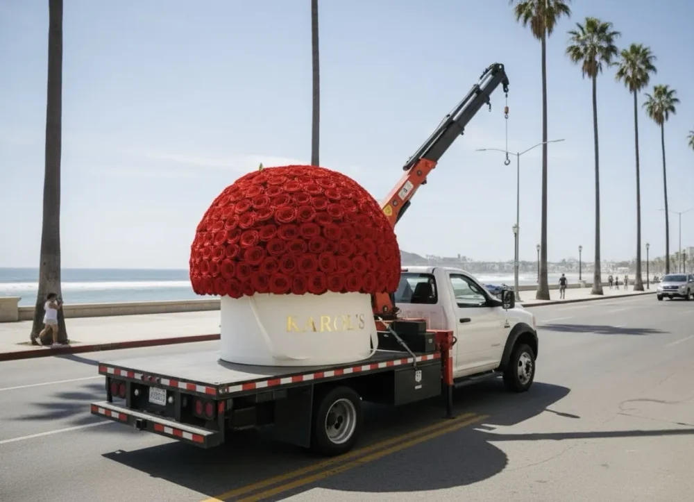 Nuestra Cúpula Imperial de Rosas está compuesta por cientos de rosas rojas premium cuidadosamente colocadas para formar una esfera perfecta sobre una base blanca elegante con el sello dorado de KAROL’S.