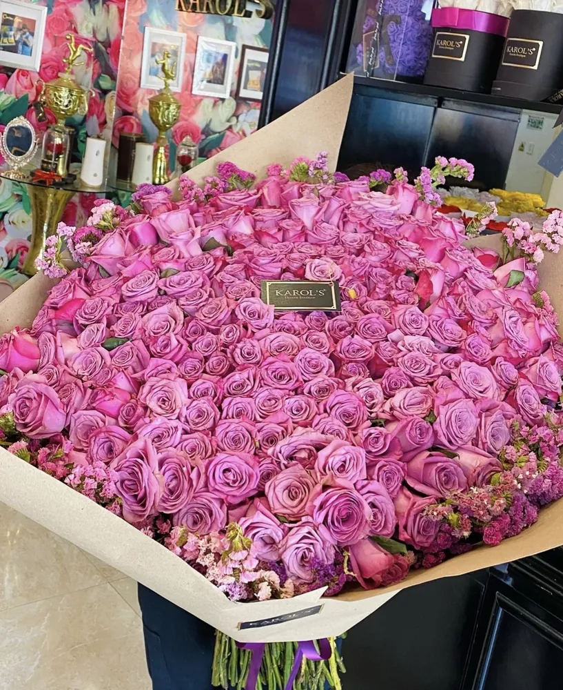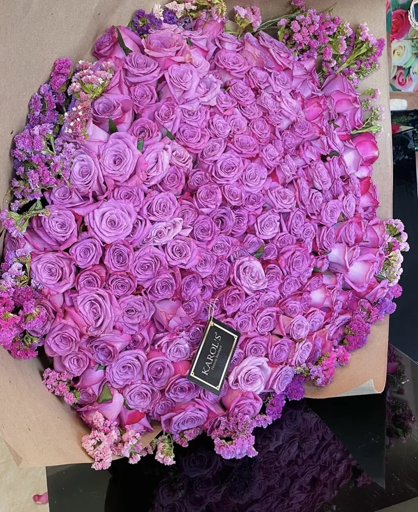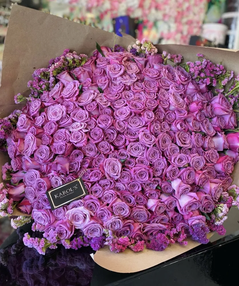 Hermoso Bouqueth de 200 rosas violetas con follajes en leticias, atado con liston de seda morado.💜💟
