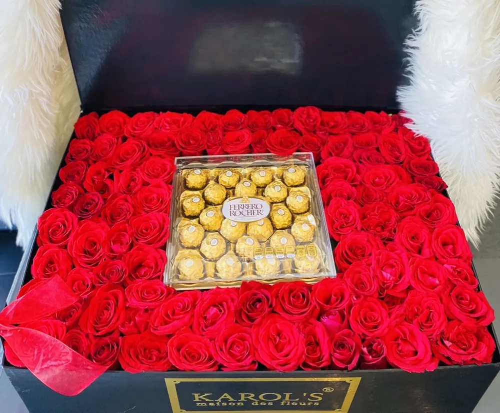 Hermosa caja de 100 rosas y chocolates Ferrero rocher atado con miño de seda rojo ❤️