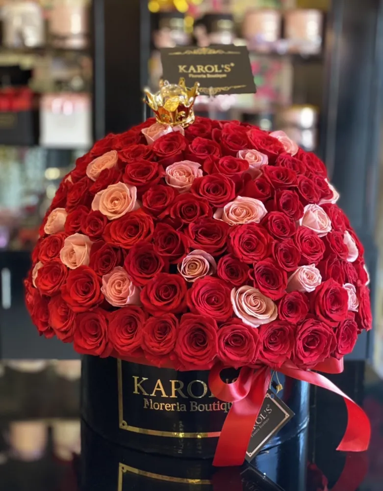 Exquisito Arreglo en caja de 200 rosas rojas y rositas atado con liston de seda liso, adornado con topping de corona 👑 incluye tarjeta de lujo.