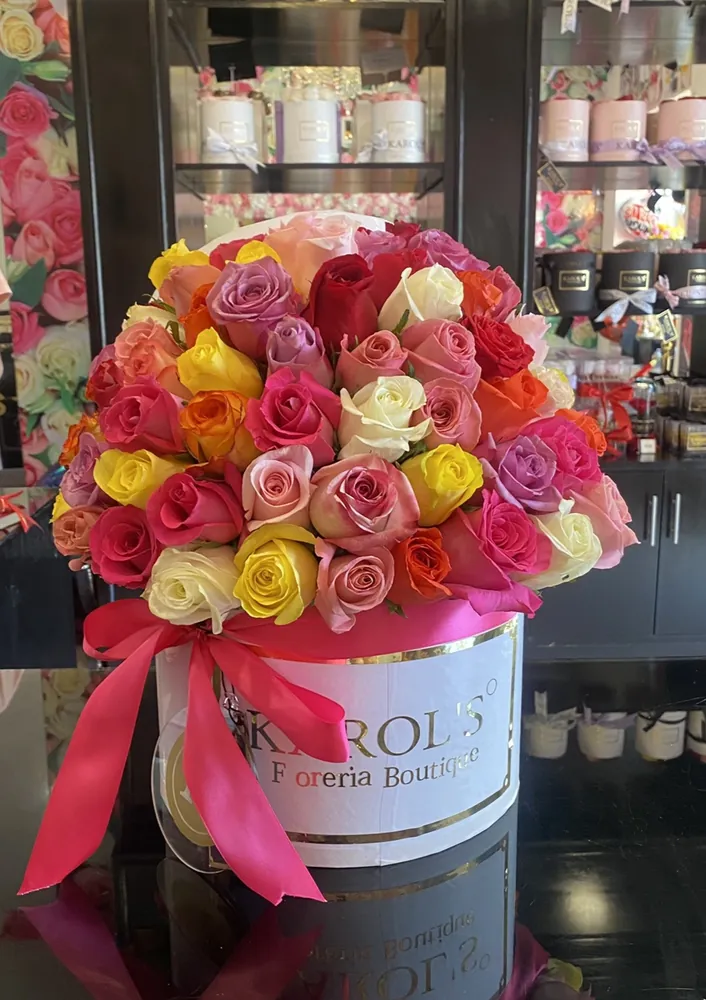 Hermoso arreglo en caja de 50 rosas colores de temporada.