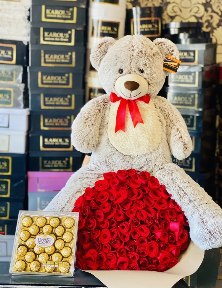 Combo de Oso de peluche de 1.mt. De altura, Bouqueth de 100 rosas rojas y caja de chocolates o globo a elegir.