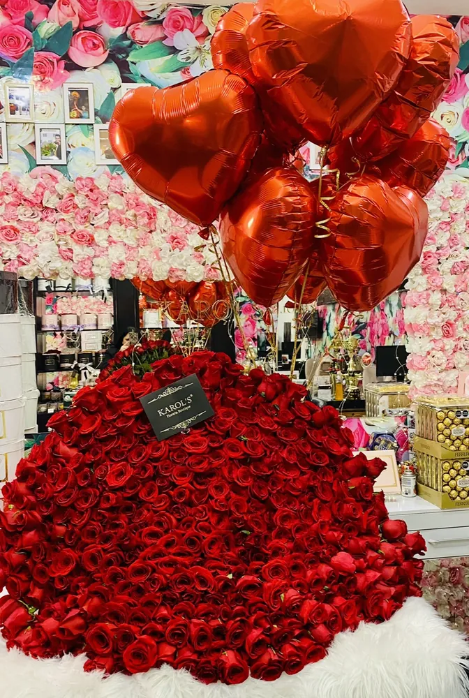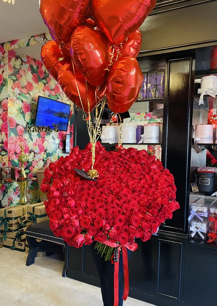 Hermoso ramo de 365 rosas rojas 🌹 y 10 globos de corazón atado con liston de seda.