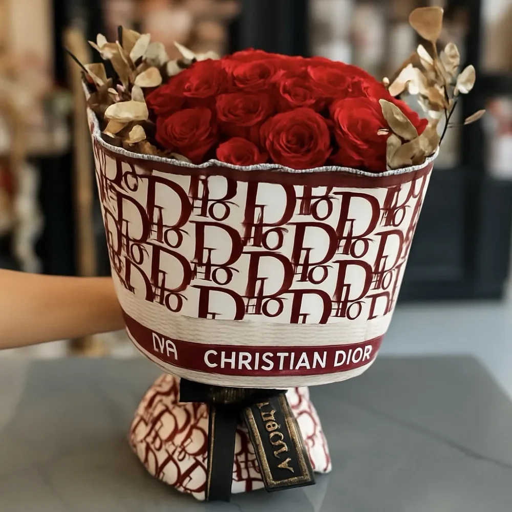 Hermoso ramo de 24 rosas rojas con dolar dorado y envuelto en papel dior rojo y atado con listones de seda rojo.