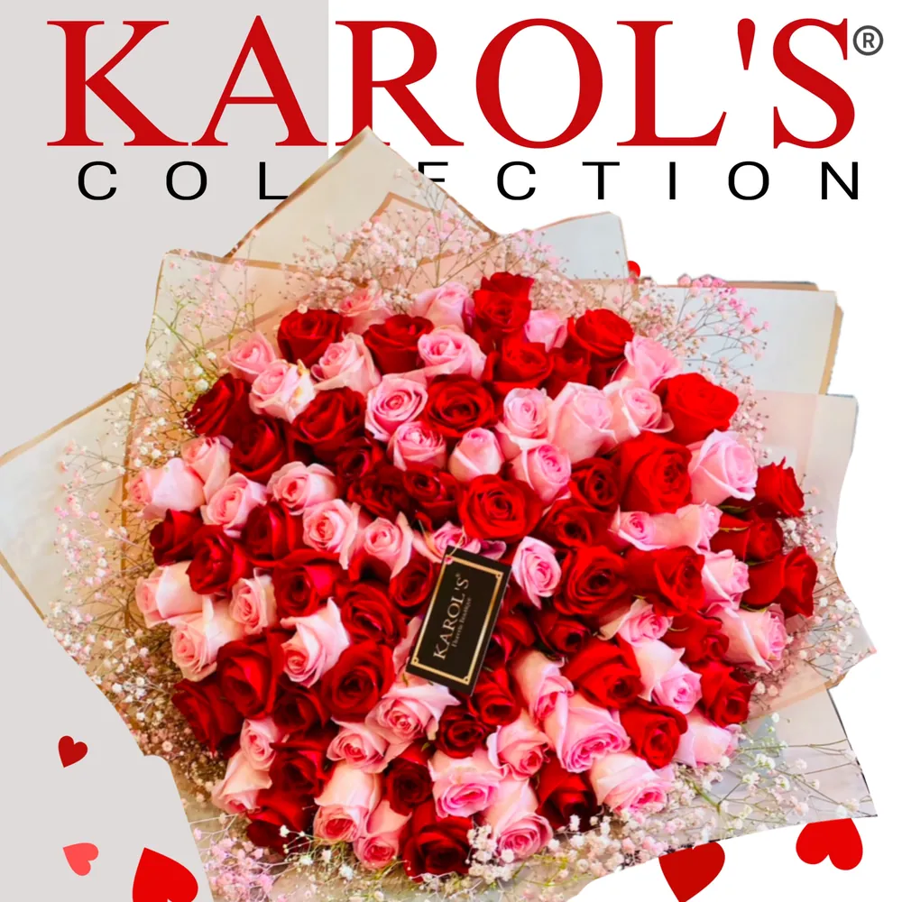 Hermoso ramo de 100 rosas rojas y caricias adornado con gypsophilia envuelto en papel rosado y atado con liston de seda rosa.