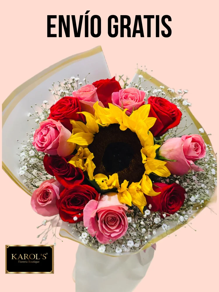 Ramo de 12 rosas con un girasol y follajes finos.