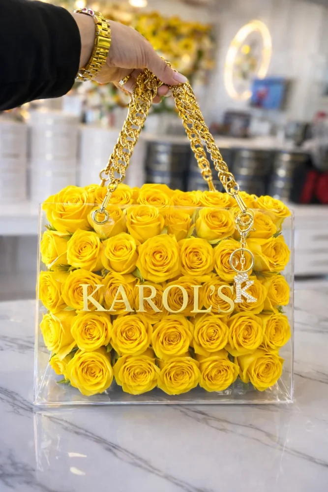 Nuestra Bag KAROL’S combina el glamour de una bolsa de lujo con la intensidad del amor expresado en rosas rojas premium, cuidadosamente seleccionadas y colocadas a mano.