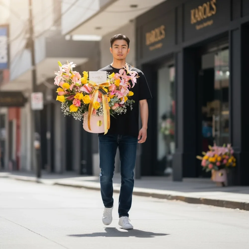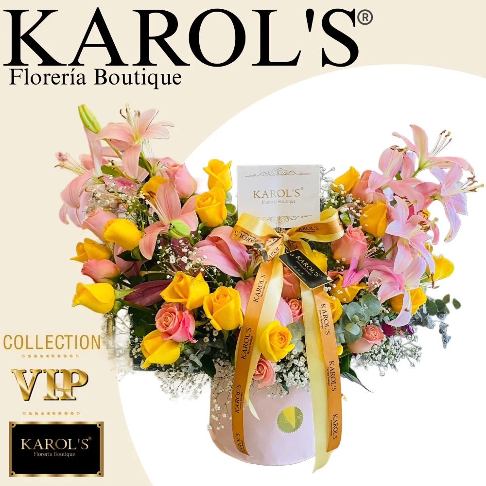 Hermoso Arreglo, en 🔱caja de lujo elaborado con Rosas Amarillas y Lili Rositas, y como complemento follajes fino y listón de seda